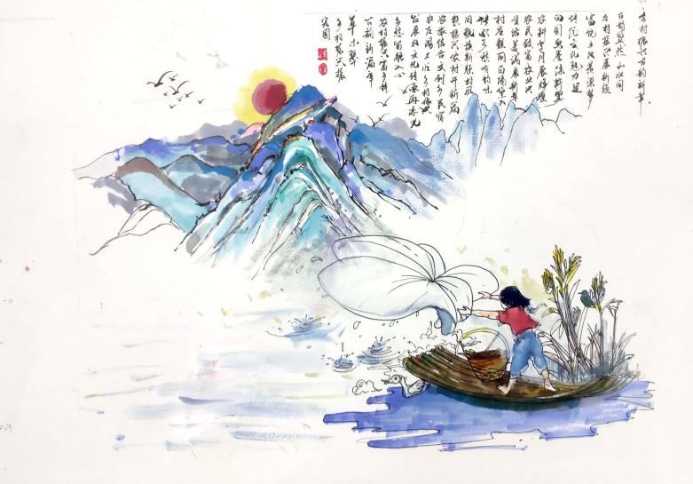 23环设2班熊伟的作品《和美乡村》,运用国画的渲染和留白技法,描绘出山间池塘孩童撒网捕鱼的生动场景。画面构图上,青峦叠翠,夕阳西下,营造出“采菊东篱下,悠然见南山”般的诗意氛围。