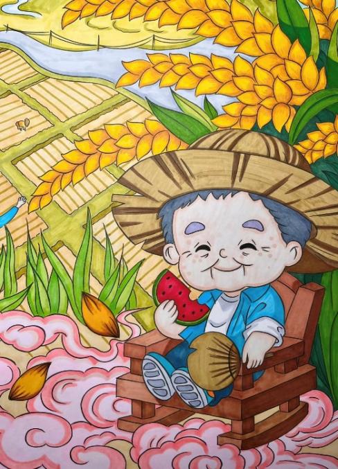 23视传1班何佳美的作品《“农”墨重彩绘乡村》,以黄色和绿色为基调,画面上一位农民手持稻穗、笑容满面,纵横交错的水路、错落有致的房屋,生动描绘了人与乡村自然和谐共生的美好景象。