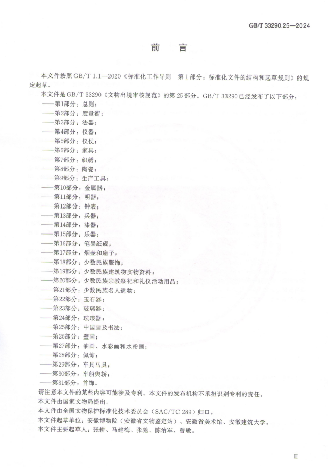 本网讯 9月29日,国家市场监督管理总局(国家标准化管理委员会)发布国家标准公告(2024年第22号),由国家文物局指导,安徽博物院(安徽省文物鉴定站)安徽省美术馆、安徽建筑大学作为起草单位编写中华人民共和国国家标准GB/T 33290.25-2024《文物出境审核规范第25部分:中国画及书法》国际标准ICS97.195CCS Y 88,该标准规范将于2025年4月1日实施。