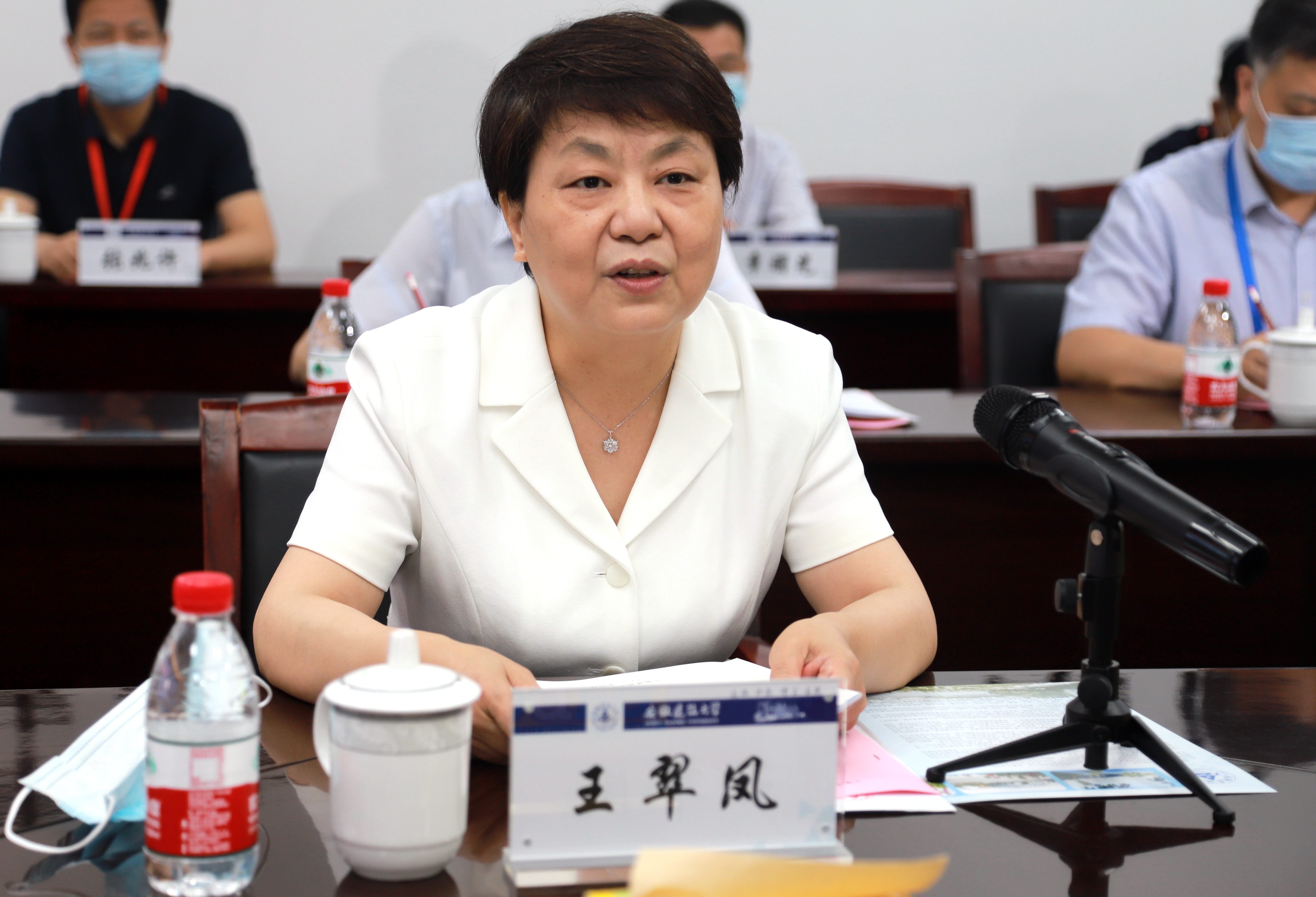 在南校区电教楼103会议室,王翠凤听取了校党委书记、校长孙道胜作的安徽建筑大学评卷点高考网评工作汇报,对学校评卷工作开展情况和疫情防控、安全保卫、后勤服务等保障工作给予充分肯定,并提出指导意见。王翠凤强调,评卷是高考高招的关键环节,关乎社会和谐稳定和考生的切身利益。要继续紧绷思想之弦,严格落实评分细则、评分标准和有关制度规定,把准评卷尺度,细化工作程序,严明工作纪律,全方位、全过程把好评卷质量关。