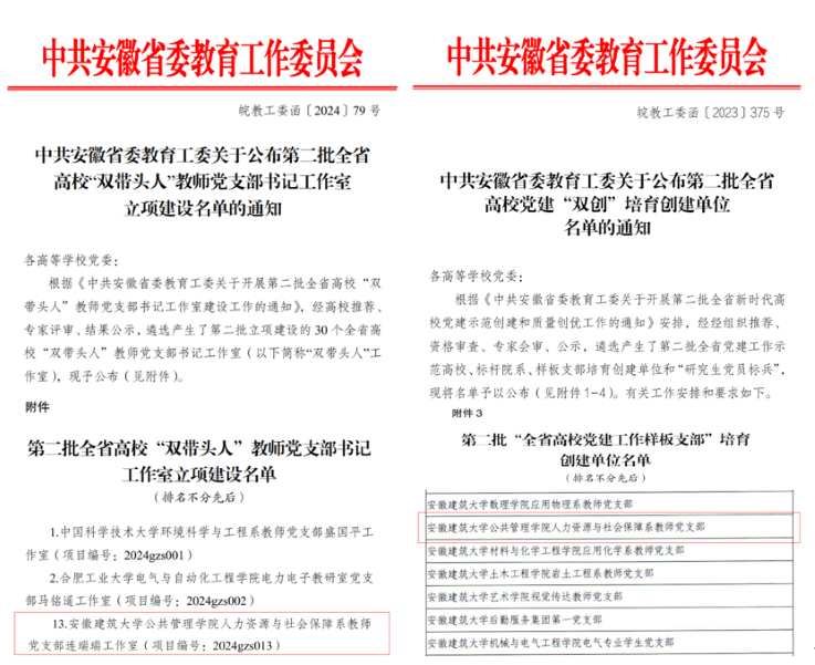 本网讯 近日,中共安徽省委教育工委发布《关于公布第二批全省高校“双带头人”教师党支部书记工作室立项建设名单的通知》,遴选建设全省高校30个 “双带头人”教师党支部书记工作室,学校公共管理学院人力资源与社会保障系教师党支部连瑞瑞工作室获批立项建设。