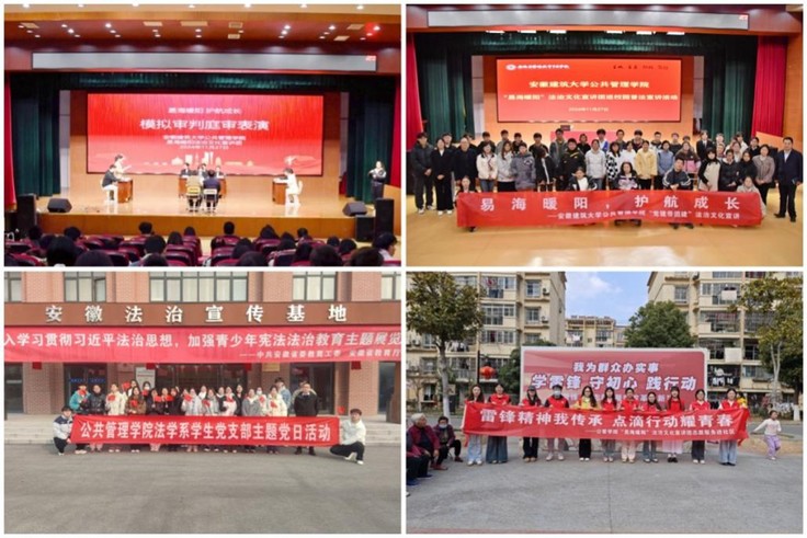 在学院党委的指导下,“易海暖阳”法治文化宣讲团赴安徽省特殊教育中专学校开展“模拟审判进校园”和“法治文化专题讲座”活动,为省特教中专学校师生普及法律知识,中安在线等媒体作专题报道。团队赴霍山县东西溪乡开展普法教育社会实践活动,围绕“未成年人享有哪些权利”“如何维护自己的合法权益”“如何预防未成年人犯罪”等问题,从案例到理论,从分析到交流,从引导到思考,为孩子们送上一节鲜活的法治教育课。党支部联合蜀山区新华社区,前往馨雅书轩开展志愿服务进社区主题党日活动,增强党员与社区的联系,强化学生党员服务群众、奉献社区的宗旨意识;支部党员走进海恒社区开展普法宣传活动,通过发放宣传单、与社区居民交流的方式,普及电信诈骗防范、微信诈骗防范、风险报警等法律知识。